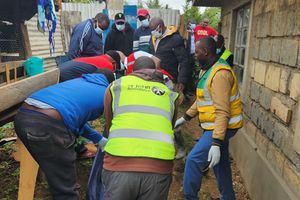 Officials from the Kenya Red Cross evacuating families marooned by flooding in Longewan village in Baringo South on May 4, 2024.