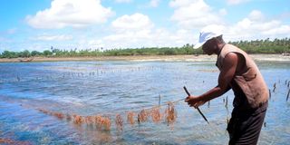 Shangani Amani Self Help Group Chairman Bakari Ali at their seaweed farm in Msambweni, Kwale Coun
