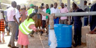 Residents watch as water is pumped from a borehole at Napuu aquifer near Lodwar town in Turkana on January 21, 2024.