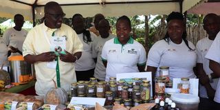 An organisation of seed savers displaying seeds for different indigenous crops during the launch of Vihiga County Agroecology Policy.