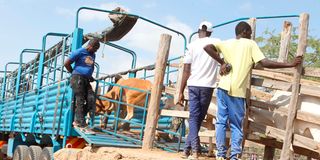 Traders load livestock into a truck at the Garissa livestock market on January 28, 2026. Prices have plummeted due to the ongoing drought, with cattle now fetching between Sh30,000 and Sh50,000, while some goats are being sold for as little as Sh2,000.