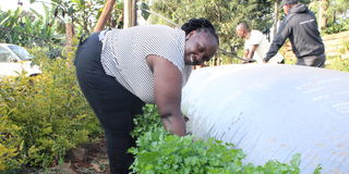 Ms Consolata Wambui harvesting coriander at her permaculture farm next to a biogas plant in Nyeri on September 8, 2025.