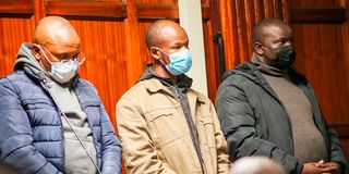 From Right; Arthur Otula, Peter Abuna and Robert Ingasira before Milimani Law Courts on October 30, 2025 where they denied 10 counts, including conspiracy to defraud Social Health Authority of Sh17.5 million.