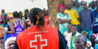 Red Cross staff members giving out food donations in Nyando on September 19, 2024.