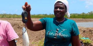 Christine Tsori weighs a fish caught in Kibokoni pond, Kilifi County