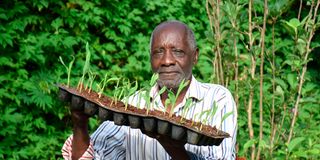 Mika Mukoko displays maize seedlings in a tray in Luanda, Vihiga County on October 23, 2025. He establishes maize in a nursery before translocating the seedlings to the farmland to accelerate growth.