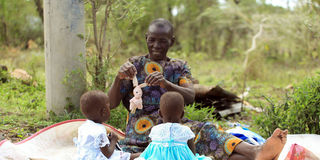 A five-minute walk from the health centre, Consolata Akeyo enjoys playtime with her twin granddaughters.