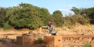 Patrick Kimanzi shows a shallow well damaged by wanton sand mining and expansion of a section of River Kivou in Kitui County on March 16, 2024. The county government has enacted a law to regulate the lucrative sand industry.