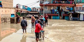 Residents maneuver through flooded water at Kware area in Pipeline, Nairobi after heavy rains on May 1, 2024.