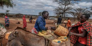 Locals with their animals in a drought affected area on August 29, 2025 in Bisil town, Kajiado County. Kenya is struggling with drought due to climate change and irregular rainfall. The drought poses a serious threat to agriculture, water supply, and livelihoods. The depletion of water resources is adversely affecting the local community, who rely on livestock for their livelihood.