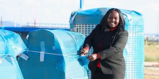 Anne Musyimi, the manager in charge of physical planning, compliance and environment at the Konza Technopolis, walks across a set of garbage bins at the city on February 10, 2025. The smart city has completed an innovative waste collection system which does not use trucks.