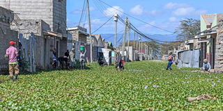 Residents of Kihoto estate on the shores of Lake Naivasha wade through hyacinth-infested water from the lake.