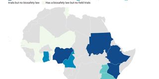 A screen grab showing the number of African countries that have biosafety laws and have commercialised GMO crops. Countries in grey have no biosafety laws.