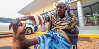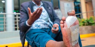 Mr Shadrack Kibiru, 62, displays his foot that is under treatment.