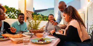 A family gathers at the table for a meal.