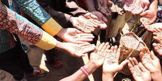 Seed savers display seeds during the Kibuka appeasement at Thana River in Tharaka.
