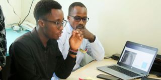 Lewis Lennox, a final-year nursing student at Karatina University (left) and Justin Ongwae, a chest clinic nursing officer, examine a chest radiograph at Karatina Level IV Hospital in Nyeri on May 21, 2025.