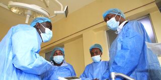 Kajiado Health Executive Alex Kilowua (right), accompanied by medics, inspecting a new theatre at Kitengela Level IV Hospital on October 21, 2025.