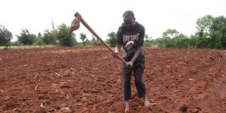 Charles Chelagat, a resident of Karona in Moiben Constituency, Uasin Gishu County, prepares his farm for planting on May 22, 2024.