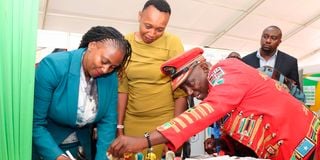 Stanley Ngara (right) engages with Principal Secretary for Public Health and Professional Standards Mary Muthoni (left) and Nation Media Group Chief Corporate Affairs and Partnerships Officer Monicah Ndung’u at National Syndemic Disease Control Council exhibition stand during the Health Summit event held at KICC in Nairobi on April 15, 2025.