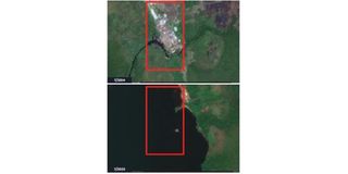 Satellite image showing buildings along Lake Baringo completely submerged in water: In 2014 vs 2022.