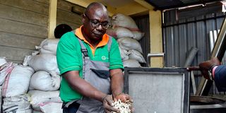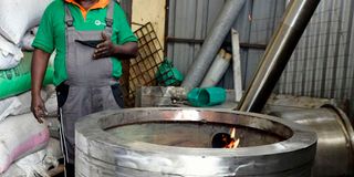Festus Agisu, the CEO of Green Air Fire Solutions, throws pellets made from sugarcane waste, into a solar-powered miomass pellet boiler at his workshop in Kahawa West, Nairobi on September 18.