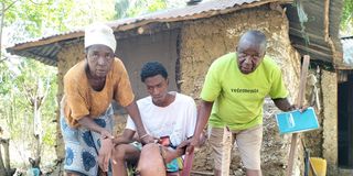 18-year-old James Furaha, a cancer patient, is supported by his father, Emmanuel Konde, and his mother, Margaret Nyevu, at their home in Mjanaheri village, Magarini, Kilifi County. The family has exhausted their resources seeking treatment for James.