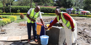 Elizabeth Kinyanjui and George Mwangi, co-founders of GeoBlue Engineering, during the launch of a borehole they drilled at Nairobi Pentecostal Bible College