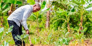 Kansiime Jackson, a Ugandan farmer, tending to his vegetable farm. He stopped growing vegetables after learning that dairy farming was more beneficial.