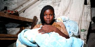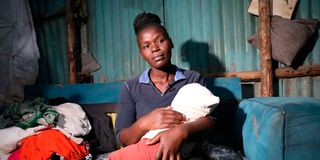 Cradling her child, Angela Peninah shares her experience as a mother navigating the aftermath of floods in Hazina, South B, Nairobi on March 12.