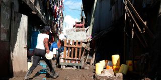 A woman carefully steps through the thick mud left behind by floodwaters in Hazina, South B, Nairobi on March 12. The flooding has severely disrupted daily life, destroyed homes, and raised concerns about health risks for local residents.