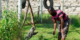 A worker at Buteyo Miti Park Conservancy in Bungoma County plays with a De Brazza’s monkey.