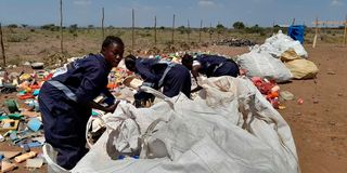 Plastic waste collectors at a plastic crusher in Kakuma town on February 18, 2024.