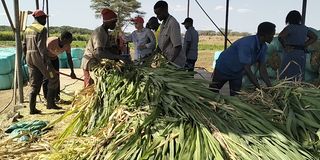 Crushing and baling of harvested Juncao grass in Nayuu village in Turkana County.