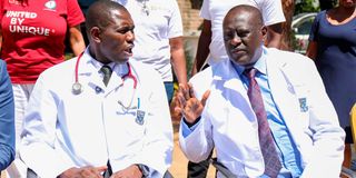 Medical Services Principal Secretary Dr. Ouma Oluga (left) engages with Kenyatta National Hospital CEO, Dr Richard Lesiyampe, during the marking of World Cancer Day under the theme “United by Unique: Focusing on Patient-Centred Cancer Care” at Kenyatta National Hospital on February 4, 2026.