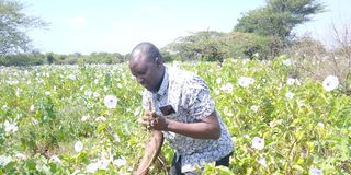 Mr Wilson Mayion, a herder from Kajiado East, uproots Ipomoea plants at a grazing field on May 30, 2024.