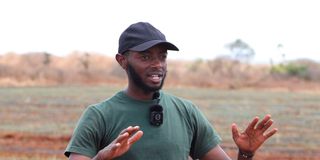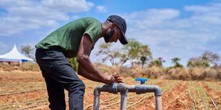 David Kamau inspects his onion crop in Emukutan Village, Kajiado County on August 28, 2025. He has deployed advanced drip irrigation technology to minimise water wastage.