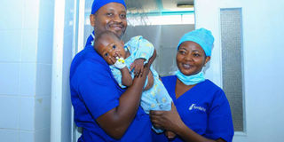 Meru Teaching and Referral Hospital CEO Dr James Kirimi and nurse Dorothy Kinoti prepare baby Angel for her cleft lip and palate surgery recently. PHOTO | DAVID MUCHUI | NATION MEDIA GROUP
