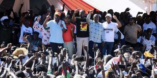 Gospel artiste Ben Githae (centre) entertains guests during Azimio la Umoja campaign rally in Thika.
