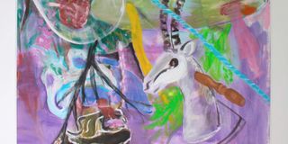 The humour is more like satire bordering on surrealism as, for instance, when in a work like ‘In Great Reserves’, he paints (in both oils and acrylics) antelopes, (possibly elands or Thomson’s gazelles) in flight but still wearing the necklaces that the taxidermist placed for the dead animals’ heads to hang on a wall.
