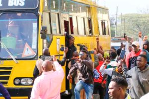 A crowd escort a school bus ferrying Butere Girls’ students from Melvin Jones Academy in Nakuru on April 10, 2025. The learners refused to perform the ‘Echoes of War’ play in the ongoing National Drama and Film Festivals.