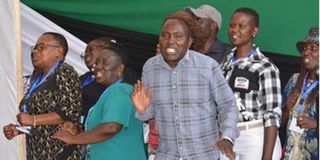 Drama teachers and trainers perform a Dholuo cultural dance during the Kenya National Drama and Film Festival workshop at Kisumu Girls High School on November 26, 2025.