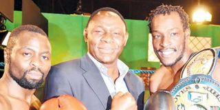 Sense8's Kenyan actor Lwanda Jawar (right) poses with former Permanent Secretary Dr Bitange Ndemo and a fellow actor.