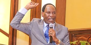 Music Copyright Society of Kenya CEO Ezekiel Mutua addressing participants during distribution of royalties to their members at Safari Park Hotel in Nairobi on January 25, 2024.
