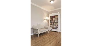 Corner bookshelves provide a perfect place to display books, photos and flower vases.