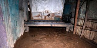 A bed sits abandoned inside a house filled with thick mud after flash floods swept through Hazina, South B.