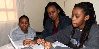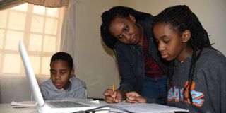 Mary Magdalene facilitates a lesson for her children, Talia Zawadi,14, and David Baraka, 11, at their home in Fedha Estate, Nairobi, on August 24, 2020.