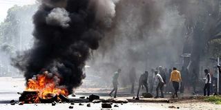 Demonstrators light up fire on Juja Road at Mathare Kwa Chief on March 27,2023 during anti government demonstrations.