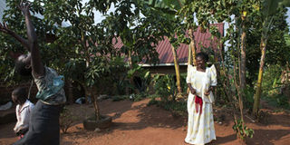 Mary Namata, 48, who has large tumors in her right breast, outside her home in the town of Buddo, near Kampala, Uganda, July 20, 2013. Photo/FILE