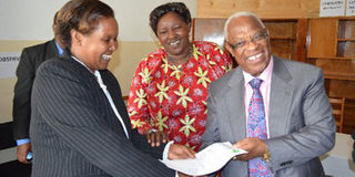 Kiambu County Returning Officer Dorcas Manka gives the nomination clearance certificate to Kanu Senator Nominee Stanley Githunguri ahead of 2013 general elections. PHOTO | FILE